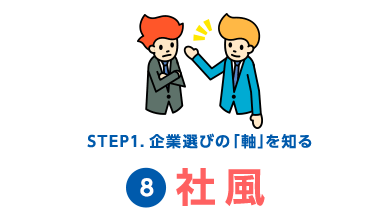 「社風」とは、企業の風土や企業文化のことです。業界ごとの傾向もありますが、同業他社を何社か受けてみると、商品に対する考え方、上下関係の在り方、職場の雰囲気など、さまざまな違いがあることに気付くでしょう。
