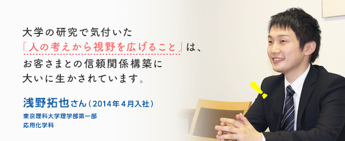 大学の研究で気付いた「人の考えから視野を広げること」は、お客さまとの信頼関係構築に大いに生かされています。浅野拓也さん(2014年4月入社)東京理科大学理学部第一部応用化学科